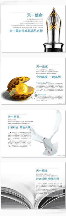 天一使命:為企業(yè)卓越竭己之智 天一追求:專的高度  一的品質(zhì) 天一愿景:引領(lǐng)行業(yè) 事業(yè)共享 天一精神:持之以恒 優(yōu)質(zhì)永恒